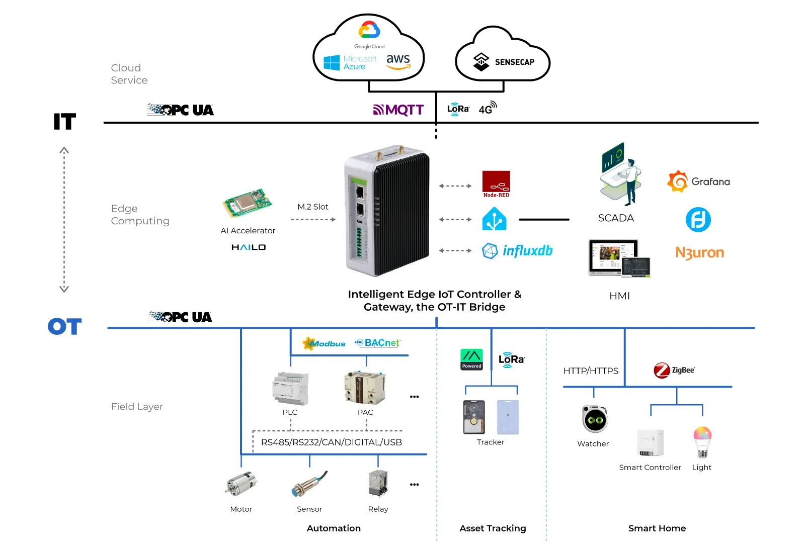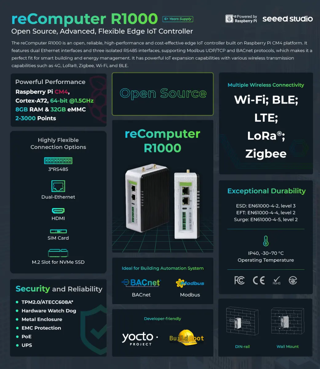 reComputer เป็นตัวควบคุม edge IoT ที่มีพลังงานและพร้อมใช้งาน สร้างขึ้นบนแพลตฟอร์ม Raspberry Pi CM4 มีหน่วยประมวลผลแบบ quad-core ทำงานอย่างมีประสิทธิภาพ รองรับการกำหนดค่าที่ยืดหยุ่นด้วย RS485 3 ช่องที่แยกออกจากกัน มี Ethernet 2 ช่อง รองรับการเชื่อมต่อไร้สายเพิ่มเติม (4G, LoRa® , Wi- Fi/BLE, Zigbee) มีหลายโปรโตคอลสื่อสาร และมีเฟิร์มแวร์ที่กำหนดค่าไว้ล่วงหน้า ใช้งานได้ดีสำหรับการปรับปรุง การบริหารจัดการอุปกรณ์ระยะไกลอย่างมีประสิทธิภาพ ควบคุมพลังงาน และอื่น ๆ ในอาคารอัจฉริยะ
